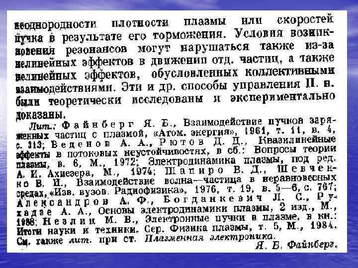 1964 1975 г. г. – ИРЭ АН СССР (ФРЯЗИНО) Статистические характеристики ВЧ колебаний, возбуждаемых при развитии неустойчивости в системе плазма-пучок. Атомная энергия, 25, 3, 213, 1968 Структура колебаний, возбуждаемых электронным пучком в плазме при развитии пучковой неустойчивости. ЖТФ, 39, 1541, 1969 Трансформация функции распределения электронного пучка при циклотронном взаимодействии с плазмой. ЖЭТФ, 59, 3(9), 657, 1970 Спецтема. «Специальная радиоэлектроника» , Сер. Электроника СВЧ, 11, 64, 1971 Одномодовое взаимодействие в турбулентном режиме плазменно -пучкового разряда. Письма ЖЭТФ, 16, 11, 602, 1972