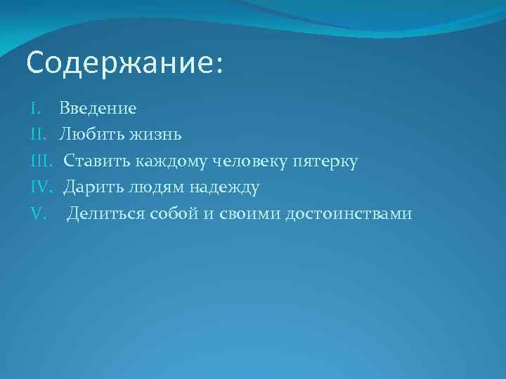 Содержание: I. III. IV. V. Введение Любить жизнь Ставить каждому человеку пятерку Дарить людям надежду Делиться собой и своими достоинствами