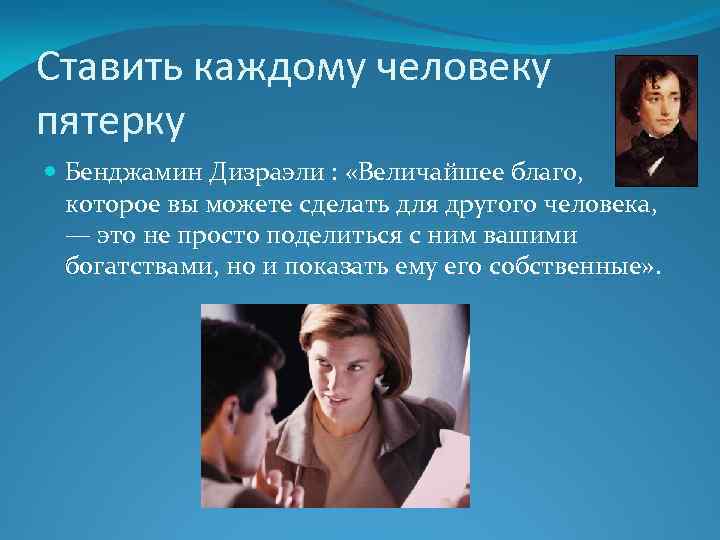 Ставить каждому человеку пятерку Бенджамин Дизраэли : «Величайшее благо, которое вы можете сделать для другого человека, — это не просто поделиться с ним вашими богатствами, но и показать ему его собственные» .