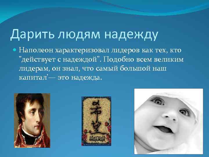 Дарить людям надежду Наполеон характеризовал лидеров как тех, кто "действует с надеждой". Подобно всем великим лидерам, он знал, что самый большой наш капитал'— это надежда.
