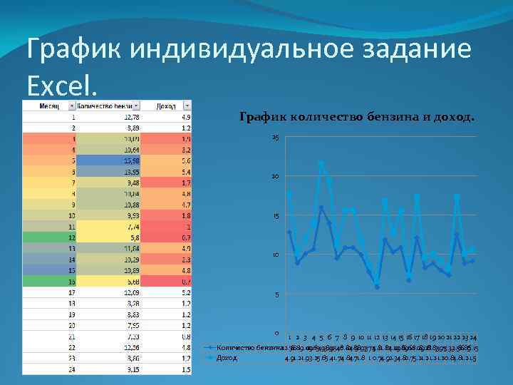 График индивидуальное задание Excel. График количество бензина и доход. 25 20 15 10 5 0 1 2 3 4 5 6 7 8 9 10 11 12 13 14 15 16 17 18 19 20 21 22 23 24 Количество бензина 12. 78 10. 09 15. 98 9. 48 10. 88 7. 74 11. 84 10. 89 12. 09 8. 83 7. 33 8. 86. 15 8. 89 10. 64 13. 95 10. 84 9. 93 5. 8 10. 29 6. 68 8. 28 7. 95 12. 56 9 Доход 4. 91. 21. 93. 25. 65. 41. 74. 8 4. 71. 8 1 0. 74. 92. 34. 8 0. 75. 21. 21. 20. 84. 81. 21. 5