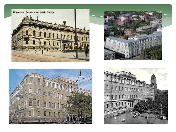 Бывший Русско-Азиатский Банк Западную сторону Сумской улицы открывает массивное здание бывшего Русско Азиатскогобанка (архит. О. Мунц, А. Шпигель, 1910 г. ), построенное в стиле модерн по проекту петербургских зодчих. Его фасад украшают две фигуры, выполненные по эскизам скульптора В. Кузнецова. Здание интересно тем, что кроме банка, расположенного на нижних этажах (внутри здания сохранился бывший операционный зал банка с восьмигранными колоннами, облицованными камнем), здесь находились другие организации, не связанные с финансовой деятельностью. Так, на верхних этажах размещались Высшие женские медицинские курсы. Четырехэтажное здание было удачно над строено на один этаж в 1925 1926 гг. После революции здание принадлежало Наркомату финансов, затем медицинскому институту, а с 1956 г. ВНИИ чермет. Сейчас здесь находятся различные учреждения и организации.