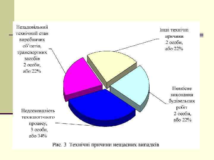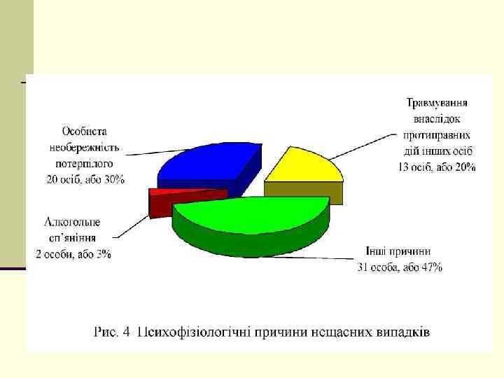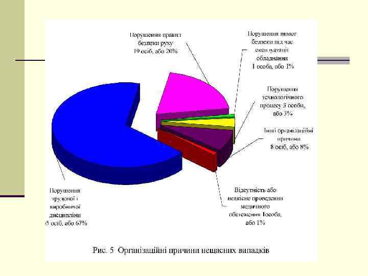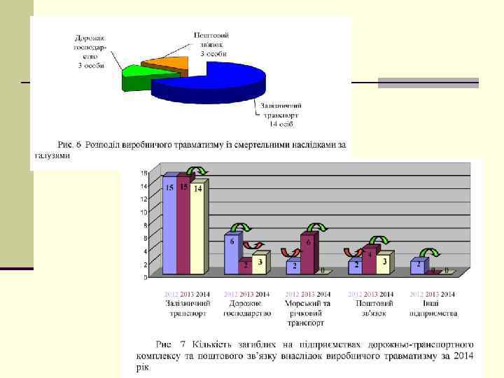 Общий анализ производственного травматизма n В течение 2014 году на предприятиях транспортно дорожного комплекса и отрасли почтовой связи было травмировано 173 человека, в т. ч. 20 смертельно. По сравнению с 2013 годом количество травмированных уменьшилось на 42 человека, или 20%, а количество погибших на 7 человек, или 24%. n Среди 173 травмированных на предприятиях: 102 (59%) работники травмированы на железнодорожном транспорте, 17 (10%) на морском и речном транспорте, 36 (21%) в области почтовой связи и 16 (9%) на предприятиях дорожного хозяйства, а также 2 (1%) на предприятиях прямого подчинения. На предприятиях гражданской авиации производственный травматизм отсутствует. Стоит отметить, что в результате АТО в Укрзализныци травмированы 22 работника, в том числе 2 смертельно; в Укравтодоре травмированы 2 работника, в том числе 1 смертельно; в УГППС «Укрпочта» травмирован 1 работника. n МИНИСТЕРСТВО ИНФРАСТРУКТУРЫ УКРАИНЫ ДЕПАРТАМЕНТ БЕЗОПАСНОСТИ НА ТРАНСПОРТЕ