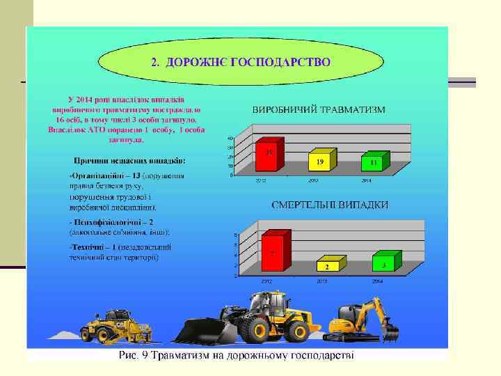 Несчастные случаи в разрезе предприятий за 2014 № Назва дочірнього підприємства п/п Кількість випадків Кількість травмованих Всього в т. ч. смертельно ДП «Закарпатський облавтодор» 1 1 3 2 2 3 3 3 4 ДП «Волинський облавтодор» ДП «Київський облдорупр» ДП «Харківський облавтодор» 2 2 5 ДП “Полтавський облавтодор” 1 1 6 7 ДП “Черкаський облавтодор” 1 1 ДП “ШРБУ 100” Інші 1 1 2 3 11 16 1 2 8 Всього: 1 3