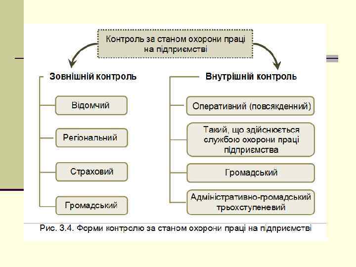 Информация про состояние ОТ Об’єкт управління Виробнича діяльність працівників Технологічні процеси Виробниче устаткування Будівлі та споруди Виробниче середовище Засоби та заходи охорони праці на підприємстві Організаційні Технічні Санітарно-гігієнічні Лікувально-профілактичні Соціально-економічні Суб’єкт управління Метрологічні Нормативно-методичні Роботодавець Служба охорони праці Інформаційні Керівники структурних підрозділів та допоміжних служб Навчальні Комісія з питань охорони праці Структура СУОП предприятия Рис. 3. 2. Структурна схема СУОП підприємства
