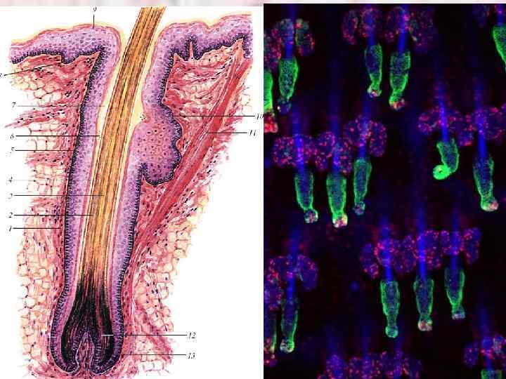 Кожа Эпидермис (происходит из эктодермы) – многослойный плоский ороговевающий эпителий Базальный слой Дерма (происходит из дерматома сомитов) Подкожная жировая клетчатка (происходит из мезенхимы) Сосочковый слой (рыхлая соединительная ткань) Шиповатый слой Зернистый слой Блестящий слой Роговый слой Сетчатый слой (плотная неоформленная соединительная ткань)