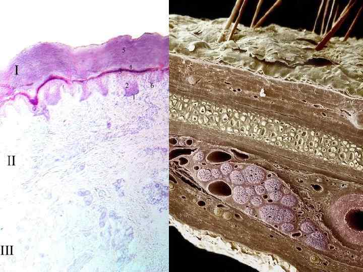 Виды кожи Толстая кожа Тонкая кожа Локализация Ладони и подошвы Все места, кроме ладоней и подошв Блестящий слой эпидермиса есть нет Волосы, сальные железы нет есть Потовые железы есть