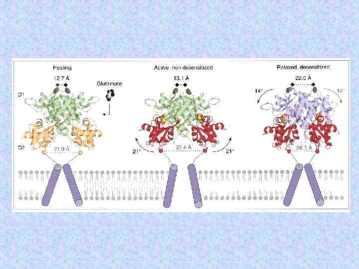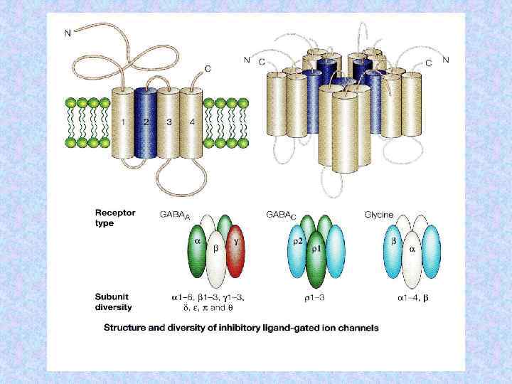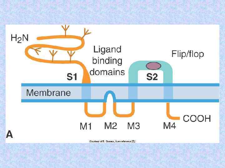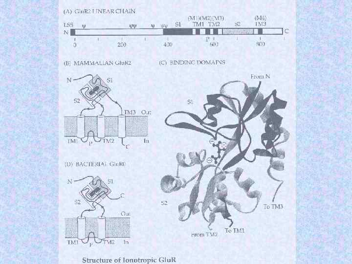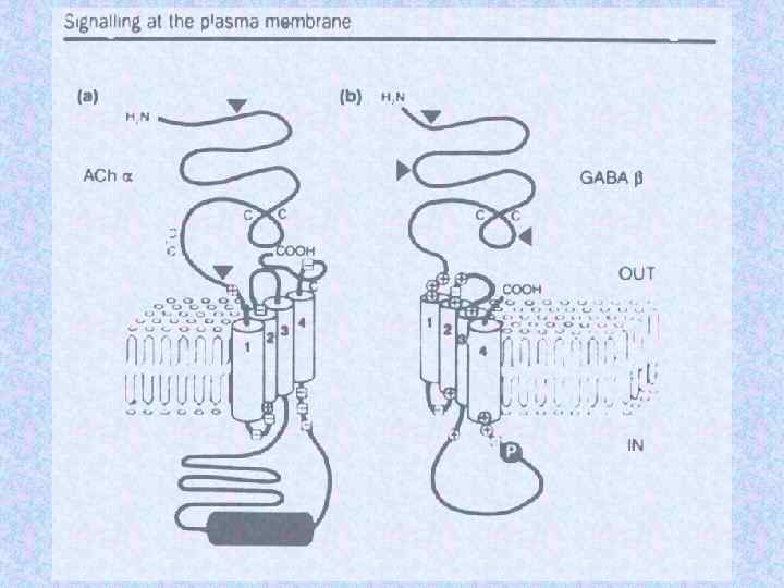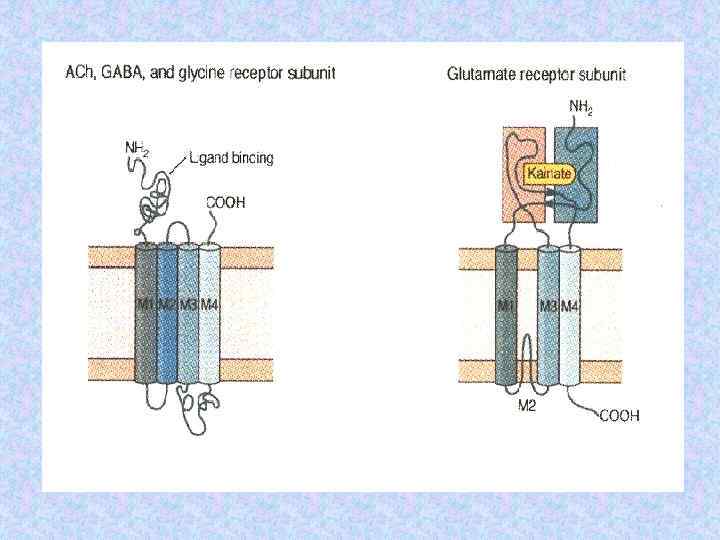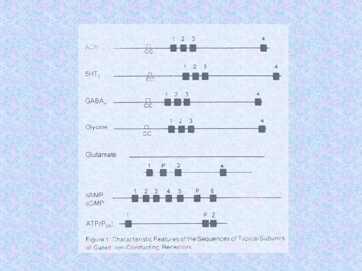 Субъединичный состав хеморецепторов Name Subunit Ach receptor a Number Residues Mass (Da) 2 1 1 1 (5) 437 469 489 501 50 116 53 681 56 279 57 565 Torpedo electric organ b g d Glycine receptor a 1 b n 5 -n (5) 421 474 48 383 53 428 bovine brain a 1 b 1 g 2 2 2 1 (5) 429 442 48 800 51 400 50 400 AMPA receptor Glu R 1 Glu R 2 2 2 (4) 889 862 99 769 96 400 c. AMP gated channel CNG 1 CNG 4 2 2 (4) 690 909 79 760 102 337 spinal cord GABA receptor