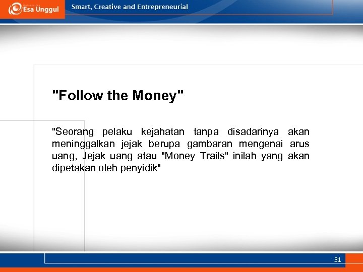 "Follow the Money" "Seorang pelaku kejahatan tanpa disadarinya akan meninggalkan jejak berupa gambaran mengenai arus uang, Jejak uang atau "Money Trails" inilah yang akan dipetakan oleh penyidik" 31