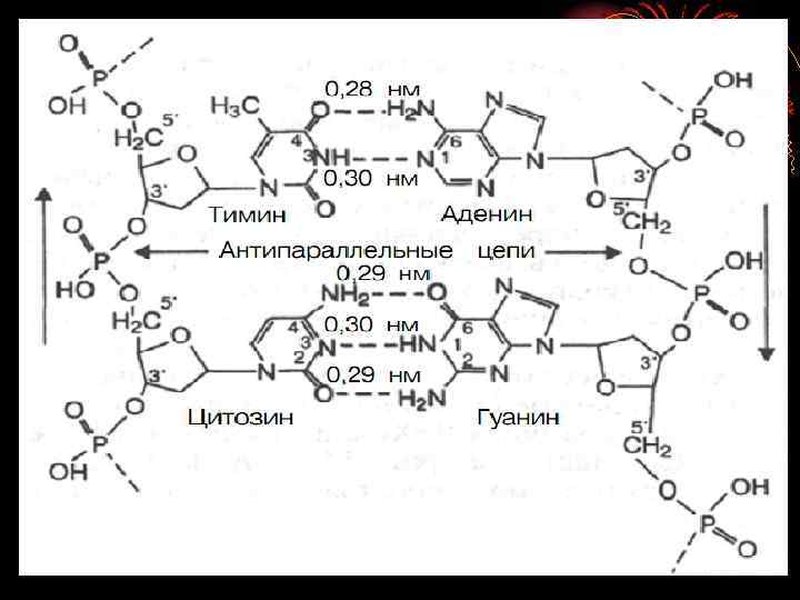 1. Принцип комплементарности – правило Чаргафа (А=Т; Ц=Г или А-Т/Ц-Г= 1). Принцип комлементарности Уотсона и Крика. 2. Формирование гетероциклов (комплементарных пар) А-Т, Г-Ц; 3. Три компонента нуклеотидов – моносахарид-С 5, азотистое основание, остатки фосфорной кислоты. - Формирование гликозитной связи; - формирование фосфоэфирной связи; - формирование фосфодиэфирных связей (реакция этерификации между ОН-группой С 3 одного нуклеода и ОН-группой фосфатного остатка другого) с формирование 5 ` и 3` - конца с образованием одноцепочечной н. к. ; Наличие 2 и 3 -х водородных связей между гетероциклами в дуплексе ДНК. Стекинг взаимодействия – ковалентные гидрофобные связи.