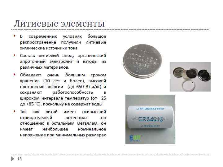 Первичные источники тока (элементы) Параметры высокое ЭДС – разность потенциалов между электродами гальванического элемента, когда между электродом и электролитом существует равновесие и через элемент не протекает электрический ток высокая емкость – количество электричества, которое элемент способен отдать при надлежащих условиях. Обычно емкость выражают через электрическую энергию (ваттчас). При сравнении элементов емкость относят к 1 кг массы (или к единице объема) и называют плотностью или удельной энергией. мощность – количество электрической энергии, отдаваемой элементом за единицу времени. Мощность определяет максимальную силу тока. низкий саморазряд – расходование электрохимически активных веществ при отсутствии тока во внешней цепи. 17