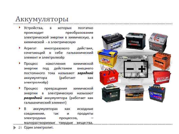 Литий-ионный аккумулятор Первоначально в качестве отрицательных пластин применялся металлический литий, затем — каменноугольный кокс. В дальнейшем стал применяться графит. Применение оксидов кобальта позволяет аккумуляторам работать при значительно более низких температурах, повышает количество циклов разряда/заряда одного аккумулятора. Распространение литий-железо-фосфатных аккумуляторов обусловлено их относительно низкой стоимостью. Литий-ионные аккумуляторы применяются в комплекте с системой контроля и управления — СКУ или BMS (battery management system), — и специальным устройством заряда/разряда. В настоящее время в массовом производстве литий-ионных аккумуляторов используются три класса катодных материалов: кобальтат лития Li. Co. O 2 и твёрдые растворы на основе изоструктурного ему никелата лития литий-марганцевая шпинель Li. Mn 2 O 4 литий-феррофосфат Li. Fe. PO 4. Электро-химические схемы литий-ионных аккумуляторов: литий-кобальтовые Li. Co. O 2 + 6 C → Li 1 -x. Co. O 2 + Li. C 6 литий-ферро-фосфатные Li. Fe. PO 4 + 6 C → Li 1 -x. Fe. PO 4 + Li. C 6 Благодаря низкому саморазряду и большому количеству циклов заряда/разряда, Li-ionаккумуляторы наиболее предпочтительны для применения в альтернативной энергетике.