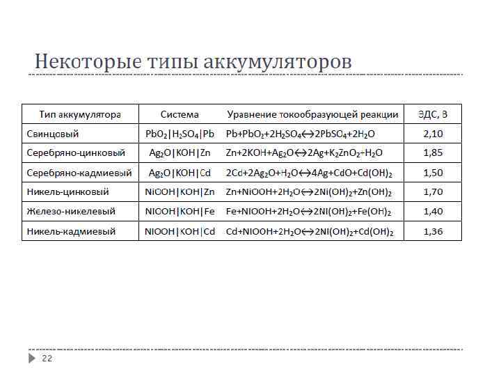Свинцово-кислотный аккумулятор Удельная предельная теоретическая энергоёмкость (Вт·ч/кг): около 133. Удельная энергоёмкость (Вт·ч/кг): 30 -60. Теоретическая удельная энергоплотность (Вт·ч/дм³): 1250 ЭДС заряжённого аккумулятора = 2, 11— 2, 17 В, рабочее напряжение 2 В (3 или 6 секций в итоге дают стандартные 6 В или 12 В соответственно) Напряжение полностью разряженного аккумулятора = 1, 75— 1, 8 В (из расчета на 1 элемент). Ниже разряжать их нельзя Рабочая температура: от − 40 C до +40 C. КПД: порядка 80— 90 %.