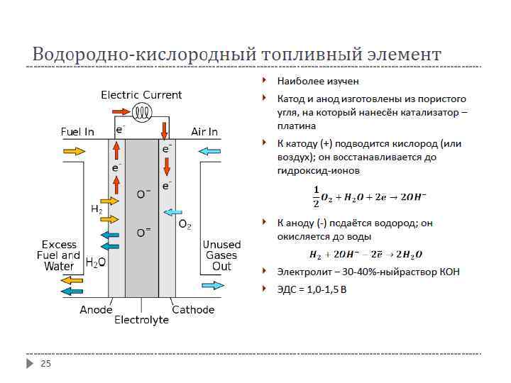 Топливные элементы В них энергия реакции горения топлива непосредственно превращается в электрическую энергию Окисление топлива происходит на поверхности индифферентных электродов (графит, платина, серебро, никель и др. ), содержащих катализатор В качестве топлива применяют водород, уголь, углеводороды, оксид углерода, метанол, гидразин N₂H₄ и другие органические соединения Топливо является восстановителем Окислителем является кислород или воздух Были источником энергии на кораблях «Аполло» американской лунной программы 30