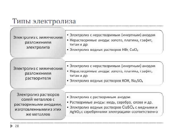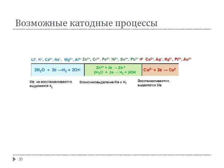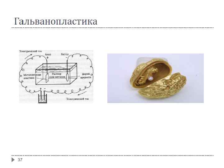 Практическое применение электролиза Электролизом раствора Na. Cl получают гидроксид натрия, хлор и водород Электролизом воды получают кислород и водород высокой чистоты Получают многие сильные окислители: гипохлорит натрия Na. Cl. O, хлорат натрия Na. Cl. O₃, хлорную кислоту HCl. O₄ и её соли, пероксид водорода H₂O₂, перманганат калия KMn. O₄, дихромат калия K₂Cr₂O₇ и др. В металлургии получают металлы (золото, серебро, медь, никель, алюминий и др. ) Электролиз с растворимым анодом используют при электролитическом рафинировании (очистке) черновых металлов (меди, серебра, олова и др. ); металл, подвергаемый очистке, является анодом Гальванопластика – получение изделий путём осаждения металла на модели Гальваностегия – нанесение металлических покрытий путём электролиза 40