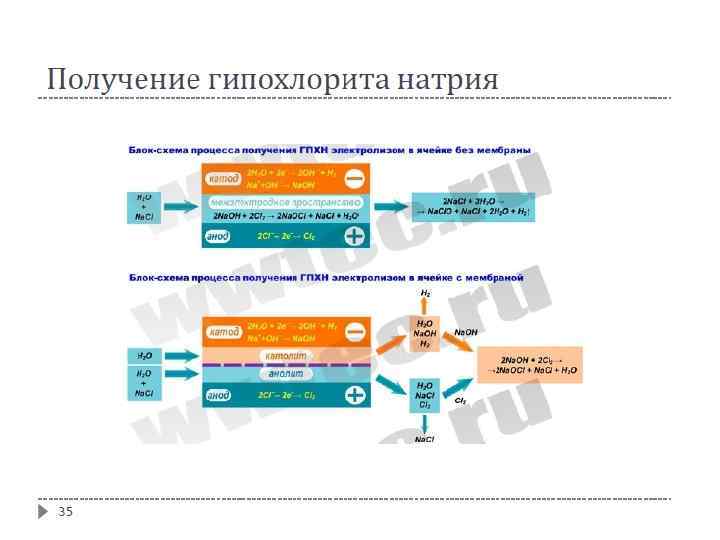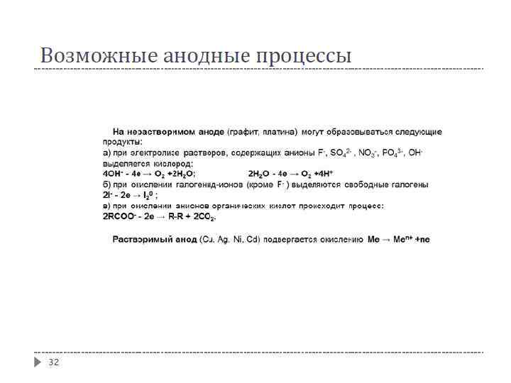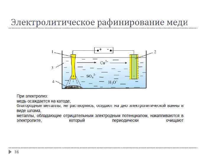 Электролиз Потенциал (напряжение) разложения – минимальное значение внешней разности потенциалов, при которой начинается электролиз данного соединения (для каждого вещества это const) Для увеличения скорости электролиза к электродам прикладывают разность потенциалов, превышающую напряжение разложение Тип электродного процесса зависит от состава электролита, материала электродов температуры, напряжения, плотности тока и др. 34