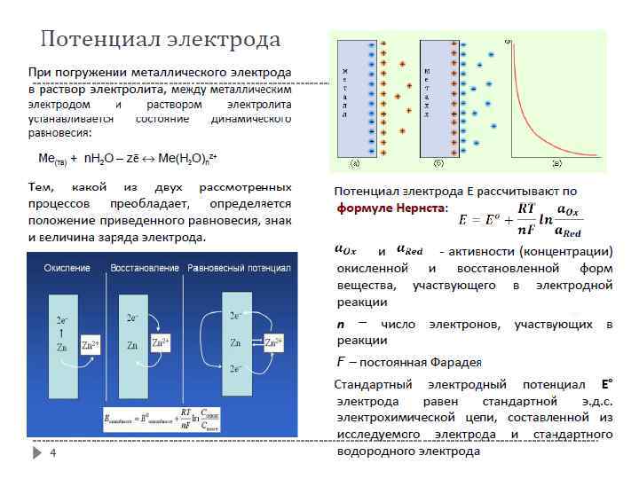Электрохимические цепи Электрод, отдающий электроны во внешнюю цепь, называется отрицательным электродом или отрицательным полюсом элемента. Электрод, принимающий электроны из внешней цепи, называют положительным электродом или положительным полюсом элемента. Анод - электрод, принимающий электроны от участников реакции (окисление). Катод – электрод, отдающий электроны участникам реакции (восстановление) 3