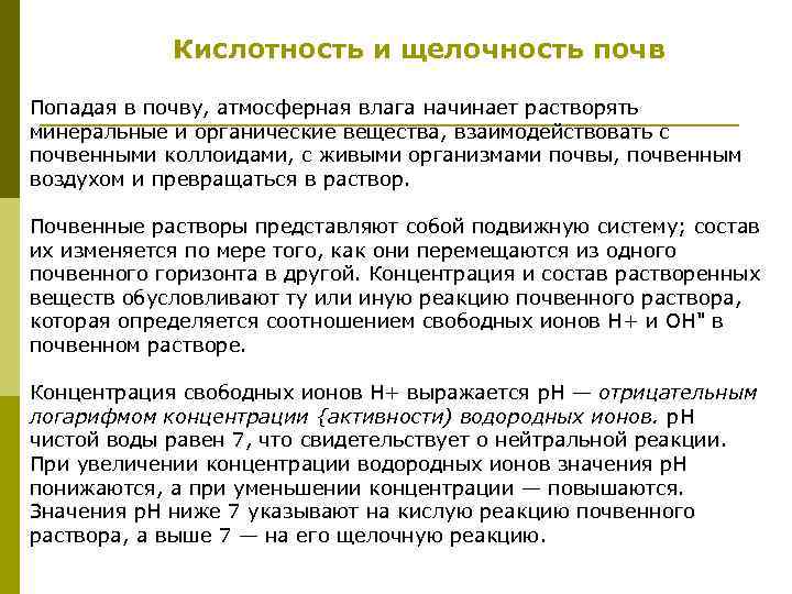 Кислотность и щелочность почв Попадая в почву, атмосферная влага начинает растворять минеральные и органические вещества, взаимодействовать с почвенными коллоидами, с живыми организмами почвы, почвенным воздухом и превращаться в раствор. Почвенные растворы представляют собой подвижную систему; состав их изменяется по мере того, как они перемещаются из одного почвенного горизонта в другой. Концентрация и состав растворенных веществ обусловливают ту или иную реакцию почвенного раствора, которая определяется соотношением свободных ионов Н+ и ОН" в почвенном растворе. Концентрация свободных ионов Н+ выражается р. Н — отрицательным логарифмом концентрации {активности) водородных ионов. р. Н чистой воды равен 7, что свидетельствует о нейтральной реакции. При увеличении концентрации водородных ионов значения р. Н понижаются, а при уменьшении концентрации — повышаются. Значения р. Н ниже 7 указывают на кислую реакцию почвенного раствора, а выше 7 — на его щелочную реакцию.