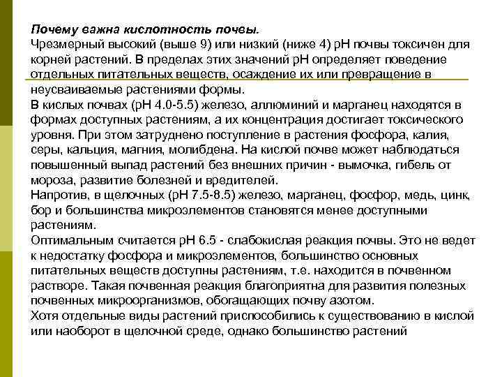 Почему важна кислотность почвы. Чрезмерный высокий (выше 9) или низкий (ниже 4) p. H почвы токсичен для корней растений. В пределах этих значений p. H определяет поведение отдельных питательных веществ, осаждение их или превращение в неусваиваемые растениями формы. В кислых почвах (p. H 4. 0 -5. 5) железо, аллюминий и марганец находятся в формах доступных растениям, а их концентрация достигает токсического уровня. При этом затруднено поступление в растения фосфора, калия, серы, кальция, магния, молибдена. На кислой почве может наблюдаться повышенный выпад растений без внешних причин - вымочка, гибель от мороза, развитие болезней и вредителей. Напротив, в щелочных (p. H 7. 5 -8. 5) железо, марганец, фосфор, медь, цинк, бор и большинства микроэлементов становятся менее доступными растениям. Оптимальным считается p. H 6. 5 - слабокислая реакция почвы. Это не ведет к недостатку фосфора и микроэлементов, большинство основных питательных веществ доступны растениям, т. е. находится в почвенном растворе. Такая почвенная реакция благоприятна для развития полезных почвенных микроорганизмов, обогащающих почву азотом. Хотя отдельные виды растений приспособились к существованию в кислой или наоборот в щелочной среде, однако большинство растений