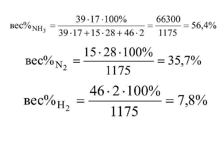 • мольный процент: мол. %NH 3=0, 39. 100=39% мол. %N 2=0, 15. 100=15% мол. %H 2=0, 46. 100=46% • весовой процент: где Мi – молярная масса данного вещества