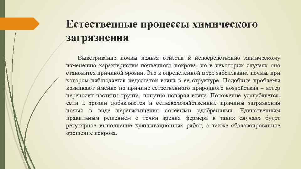 Естественные процессы химического загрязнения Выветривание почвы нельзя отнести к непосредственно химическому изменению характеристик почвенного покрова, но в некоторых случаях оно становится причиной эрозии. Это в определенной мере заболевание почвы, при котором наблюдается недостаток влаги в ее структуре. Подобные проблемы возникают именно по причине естественного природного воздействия – ветер переносит частицы грунта, попутно испаряя влагу. Положение усугубляется, если к эрозии добавляются и сельскохозяйственные причины загрязнения почвы в виде перенасыщения солевыми удобрениями. Единственным правильным решением с точки зрения фермера в таких случаях будет регулярное выполнение культивационных работ, а также сбалансированное орошение покрова.