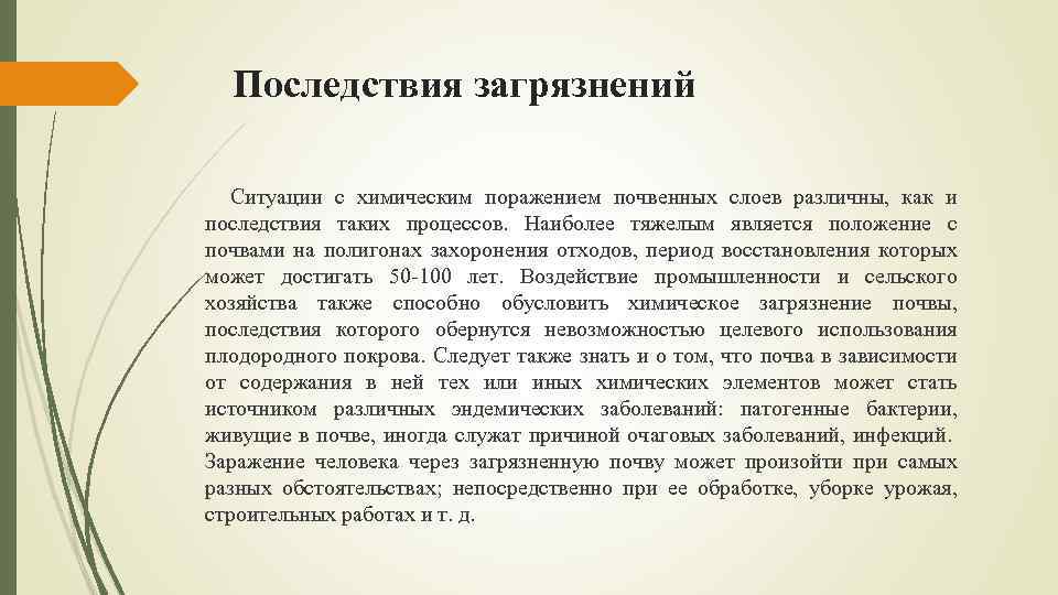 Последствия загрязнений Ситуации с химическим поражением почвенных слоев различны, как и последствия таких процессов. Наиболее тяжелым является положение с почвами на полигонах захоронения отходов, период восстановления которых может достигать 50 -100 лет. Воздействие промышленности и сельского хозяйства также способно обусловить химическое загрязнение почвы, последствия которого обернутся невозможностью целевого использования плодородного покрова. Следует также знать и о том, что почва в зависимости от содержания в ней тех или иных химических элементов может стать источником различных эндемических заболеваний: патогенные бактерии, живущие в почве, иногда служат причиной очаговых заболеваний, инфекций. Заражение человека через загрязненную почву может произойти при самых разных обстоятельствах; непосредственно при ее обработке, уборке урожая, строительных работах и т. д.