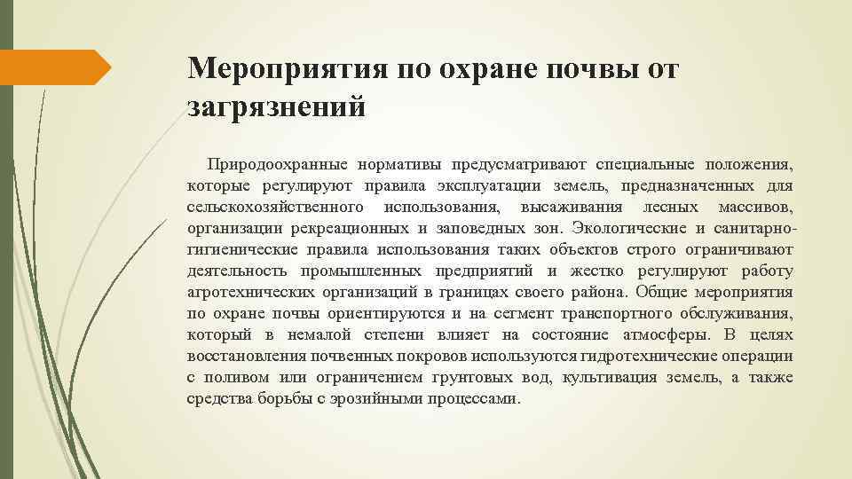 Мероприятия по охране почвы от загрязнений Природоохранные нормативы предусматривают специальные положения, которые регулируют правила эксплуатации земель, предназначенных для сельскохозяйственного использования, высаживания лесных массивов, организации рекреационных и заповедных зон. Экологические и санитарногигиенические правила использования таких объектов строго ограничивают деятельность промышленных предприятий и жестко регулируют работу агротехнических организаций в границах своего района. Общие мероприятия по охране почвы ориентируются и на сегмент транспортного обслуживания, который в немалой степени влияет на состояние атмосферы. В целях восстановления почвенных покровов используются гидротехнические операции с поливом или ограничением грунтовых вод, культивация земель, а также средства борьбы с эрозийными процессами.