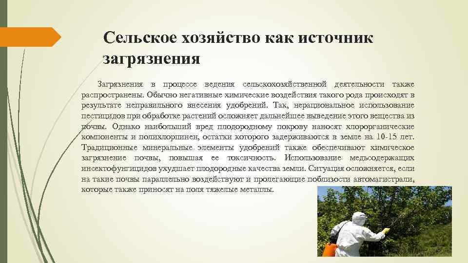 Сельское хозяйство как источник загрязнения Загрязнения в процессе ведения сельскохозяйственной деятельности также распространены. Обычно негативные химические воздействия такого рода происходят в результате неправильного внесения удобрений. Так, нерациональное использование пестицидов при обработке растений осложняет дальнейшее выведение этого вещества из почвы. Однако наибольший вред плодородному покрову наносят хлорорганические компоненты и полихлорпинен, остатки которого задерживаются в земле на 10 -15 лет. Традиционные минеральные элементы удобрений также обеспечивают химическое загрязнение почвы, повышая ее токсичность. Использование медьсодержащих инсектофунгицидов ухудшает плодородные качества земли. Ситуация осложняется, если на такие почвы параллельно воздействуют и пролегающие поблизости автомагистрали, которые также приносят на поля тяжелые металлы.