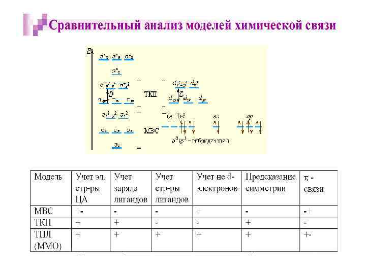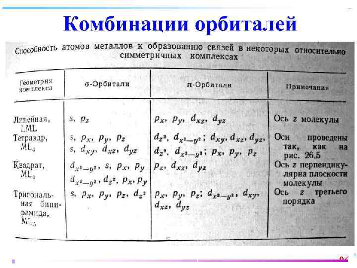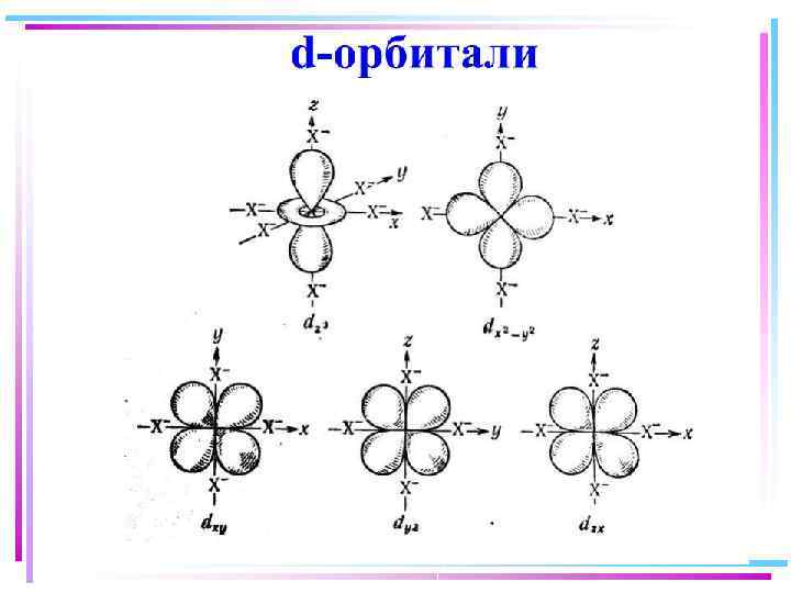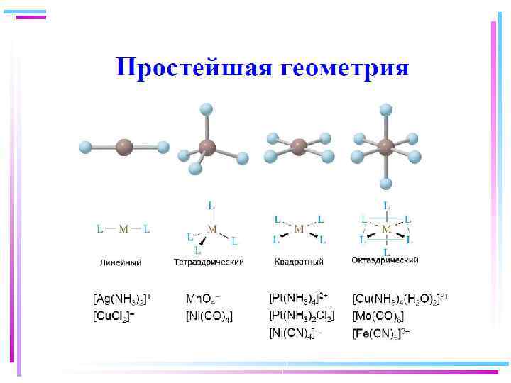 Геометрическая конфигурация комплексов Тип гибр. КЧ Геом. форма Примеры sp 2 линейн. [Ag(CN)2]-, [Cu(NH 3)2]+ sp 2 3 треуг. [Hg. I 3]- sp 3, sd 3 4 тетраэдр [Be(OH)4]2 -, [Mn. Cl 4]2 - sp 2 d(x 2 -y 2) 4 квадрат [Ni(CN)4]2 -, [Pt. Cl 4]2 - sp 3 d(z 2), dsp 3 5 триг. бипир. [Fe(CO)5] sp 3 d(x 2 -y 2), d(x 2 -y 2)sp 3 d 2, d 2 sp 3 5 квадратная пирамида октаэдр [Mn. Cl 5]3 -, [Ni(CN)5]3 - sp 3 d 3 7 6 пентагон. бипирамида [Al(H 2 O)6]3+, [Fe(CN)6]3[V(CN)7]4 -, [Zr. F 7]3 -