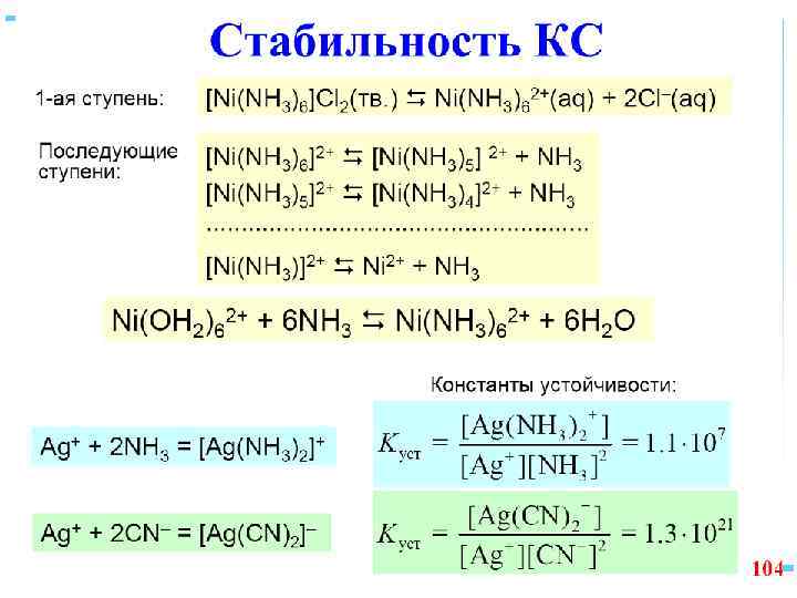 Сравнение устойчивости аммиачных комплексов Ступени комплексообразования • [Cu(NH 3)2]+ K 2(обр) = 5, 0· 104 • [Cu(NH 3)]+K 1(обр) = 1, 4· 106 Природа комплексообразователя • [Cu(NH 3)2]+ 2(обр) = 7, 0· 1010 • [Ag(NH 3)2]+ 2(обр) = 1, 1· 107 Комплекс Cu(I) устойчивее, чем комплекс Ag(I) Степень окисления комплексообразователя • [Co. II(NH 3)6]2+ 6(обр) = 1, 3· 105 • [Co. III(NH 3)6]3+ 6(обр) = 3, 2· 1032 Комплекс Co(III) устойчивее, чем комплекс Co(II)