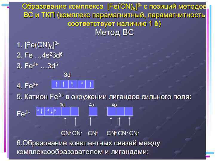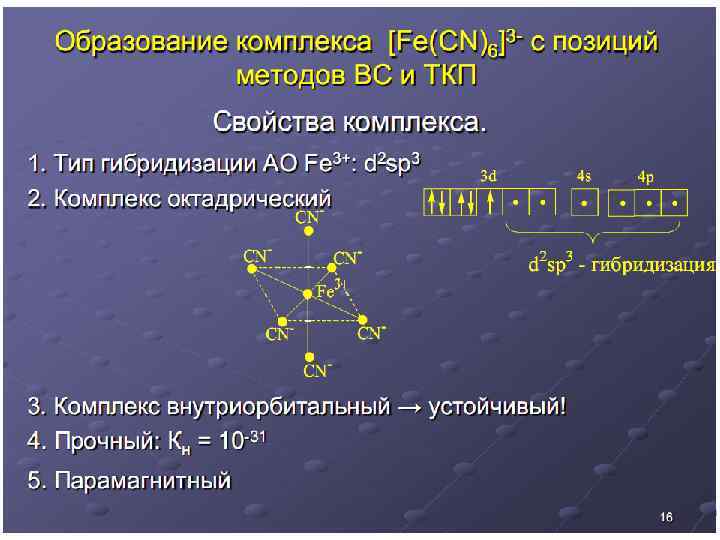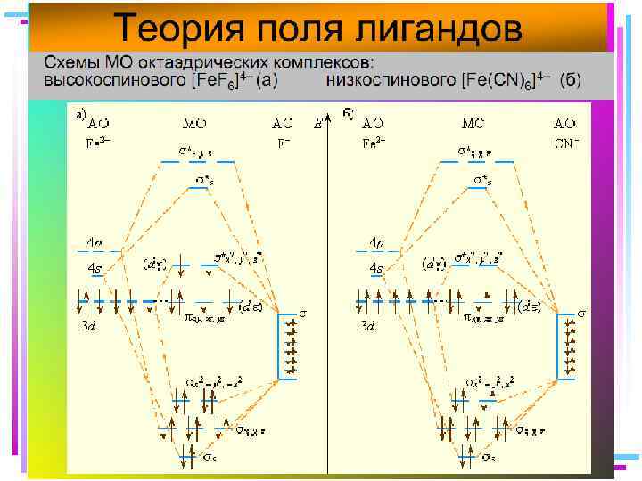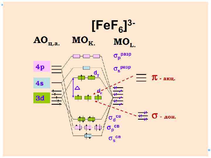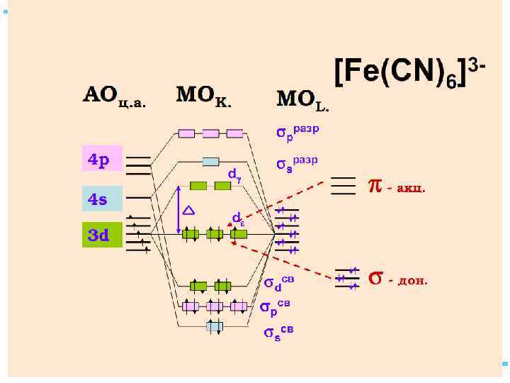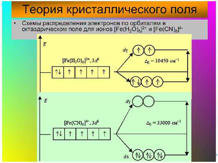 Fe+II 3 d 6 4 s o 4 p 4 d 0 КЧ 6 0 Fe+II sp 3 d 2 -гибр. [Fe. F 6]4– уст. , парамагн. , октаэдр 3 d 6 КЧ 6 4 s o 4 p 0 4 d 0 d 2 sp 3 -гибр. [Fe(CN)6]4– уст. , диамагн. , октаэдр
