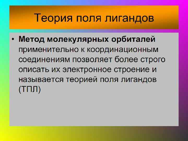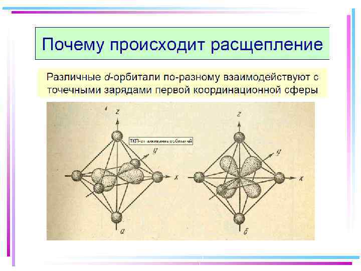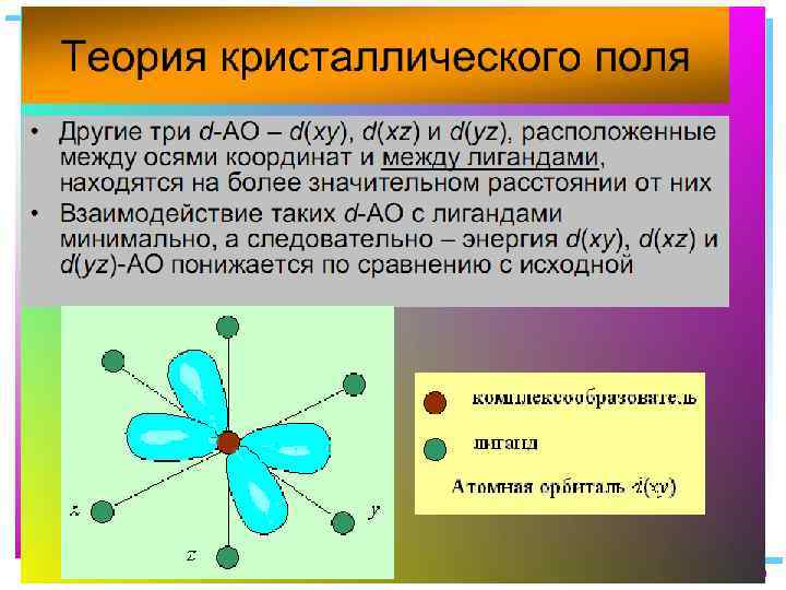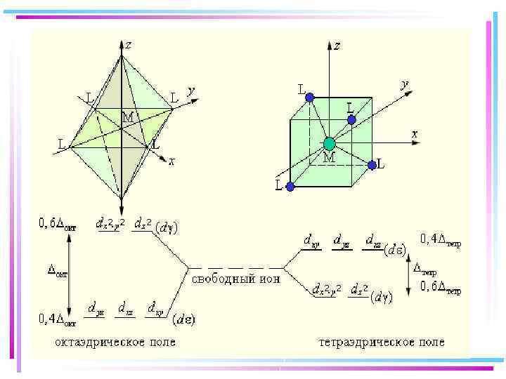 Основные положения теории кристаллического поля (поля лигандов) • Связь комплексообразователя (центр. атома) Mе с лигандами L считается чисто ионной • Лиганды L – точечные заряды в вершинах правильных полиэдров, т. е. на максимальном расстоянии друг от друга • Взаимодействие L между собой не рассматр. • Детально рассматривается влияние электростатич. поля лигандов на Mе, а именно, на энергетич. подуровни (ЭПУ) центрального атома