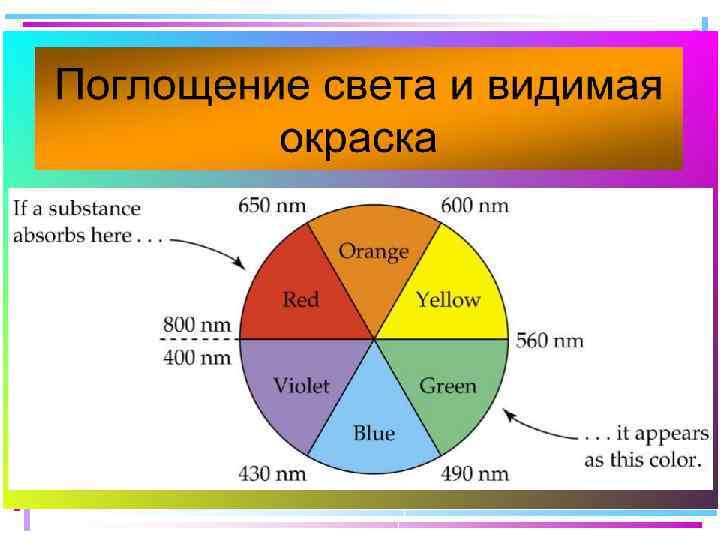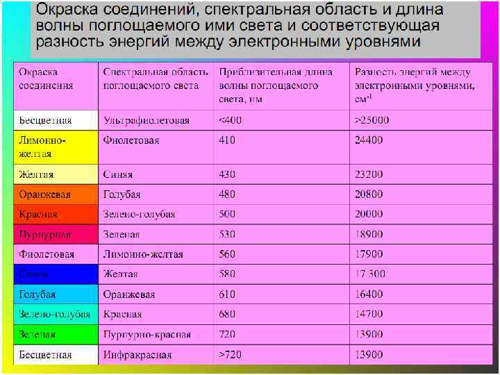 Цветность комплексных соединений • При облучении образца в-ва светом видимой части спектра может наблюдаться: • отсутствие поглощения света (образец бесцветен) • полное поглощение света (образец черный) • поглощение света определенной длины волны (образец имеет цвет, дополнительный к поглощенному). 495 400 575 440 Поглощение ( , нм) 590 625 460 495 Окраска растворов 650 520 760 580 Цвет объекта определяется частотой полос поглощения видимого света