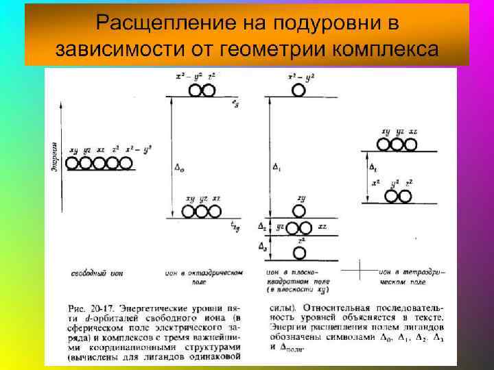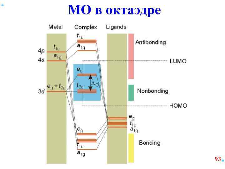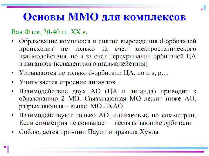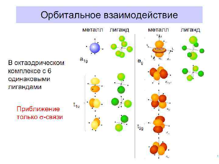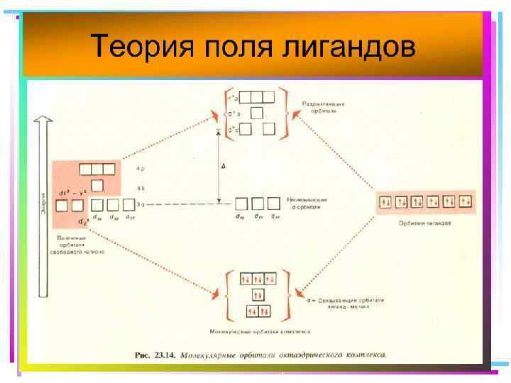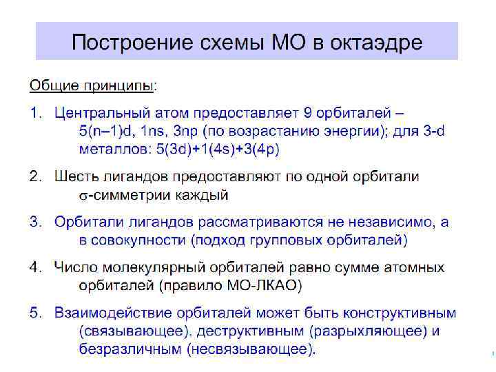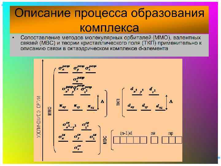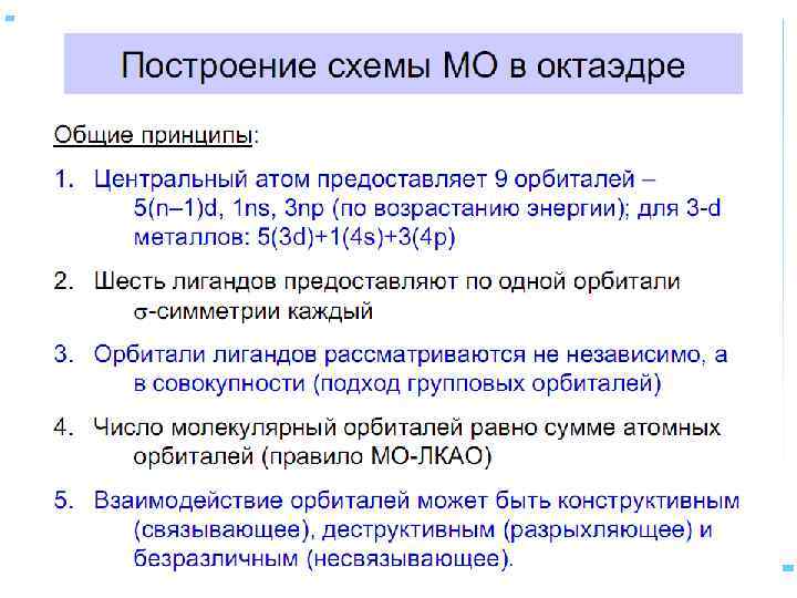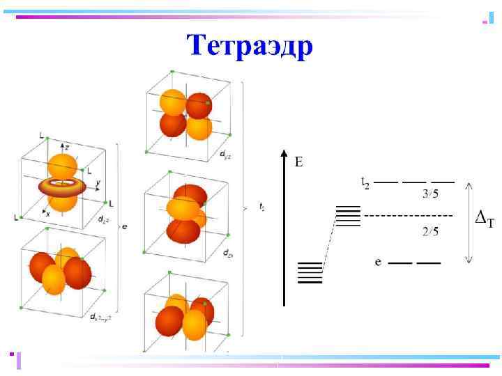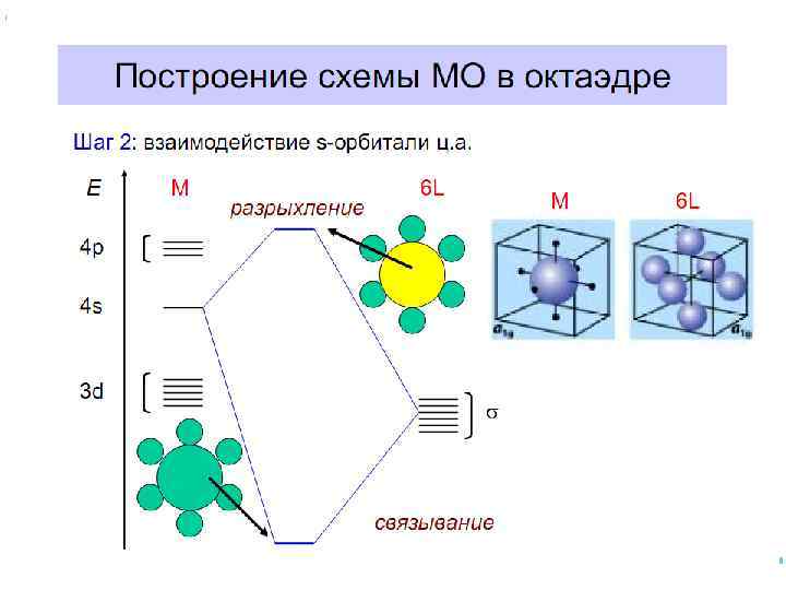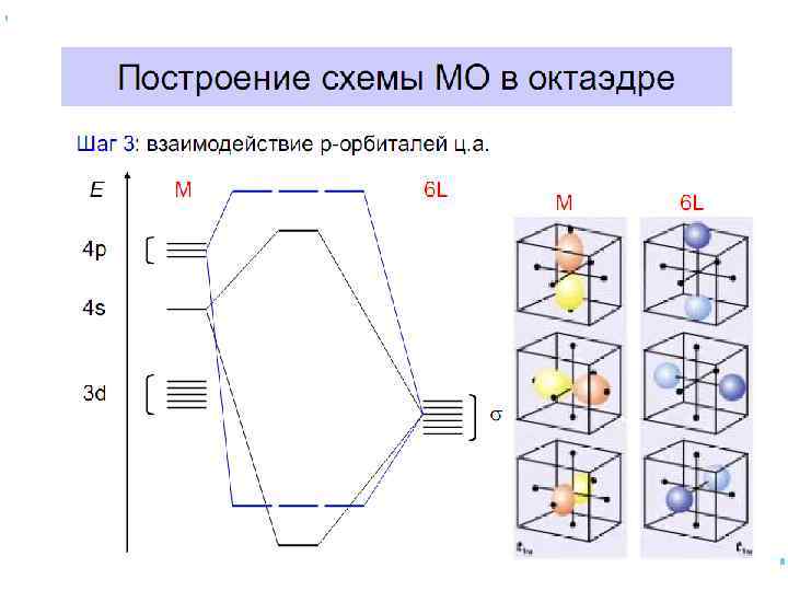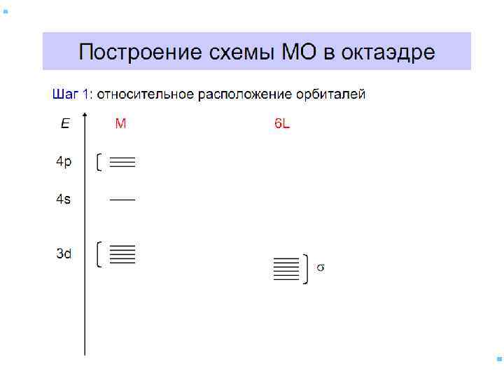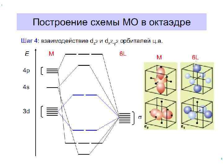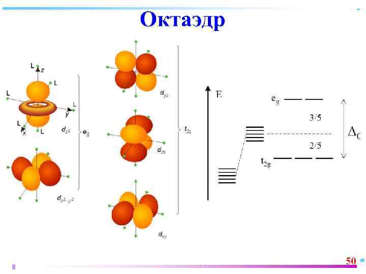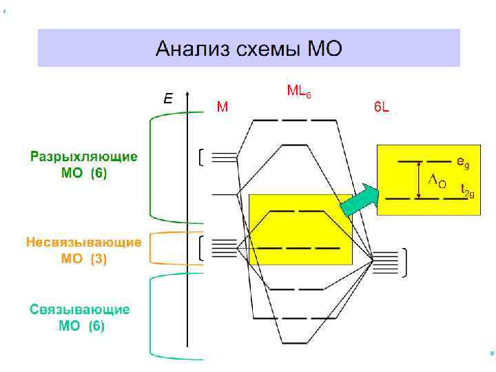 В случае [ML 6] ±, 0 : октаэдрическое поле лигандов • Поле слабо влияет (энергия падает) в случае АО d(xy), d(xz) и d(yz), располож. между осей координат (между лигандами) Eо d-АО • Поле сильно влияет (энергия растет) в случае АО d(z 2) и d(x 2–y 2), располож. вдоль осей координат (ближе всего к лигандам) d d – параметр расщепления |E –Eо| = 3/5 ; |E –Eо| = 2/5