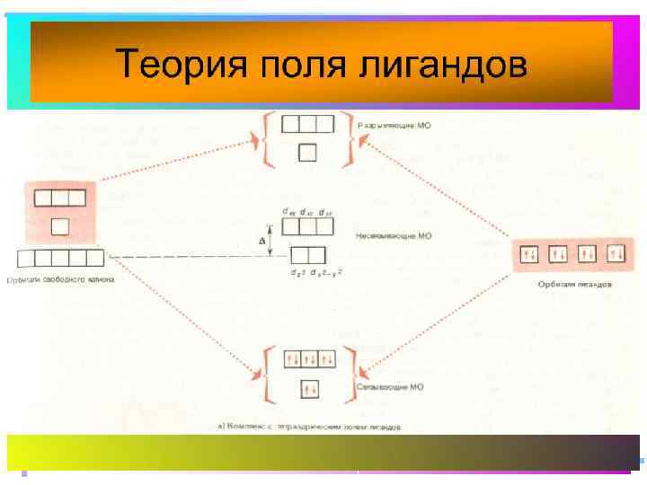 Лиганды сильного и слабого поля Fe+II: [Ar] 3 d 64 s 04 p 0 d d диамагн. [Fe(CN)6]4– парамагн. [Fe. F 6]4– Спектрохимический ряд лигандов: Br – < Cl– < F – < OH– < H 2 O < NH 3 < NO 2– < CN– CO Увеличение силы поля лигандов