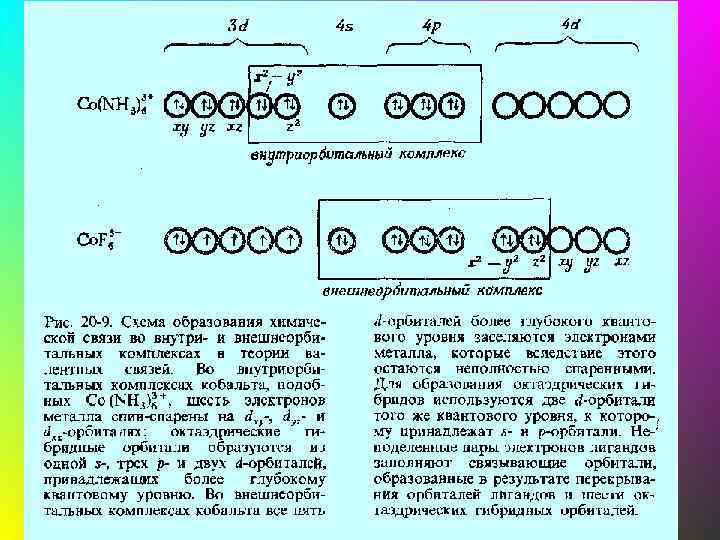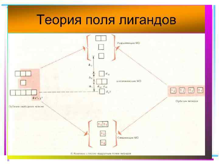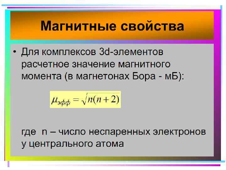Заселение электронами d -орбиталей Сильное поле Слабое поле Число эл. пар Число неспар. эл. d 4 1 2 0 4 d 5 2 1 0 5 d 6 3 0 1 4 d 7 3 1 2 3 (диамагн. )