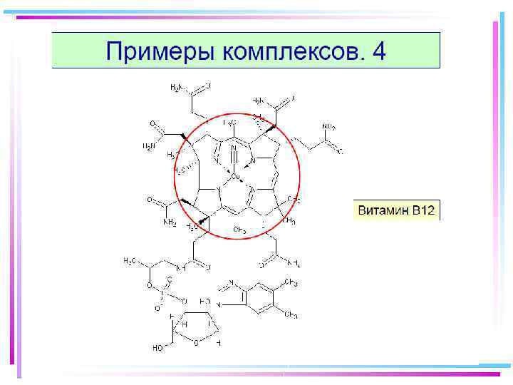 2. Формулы и названия компл. соединений. [M(L+)(L 0)(L–)]±, 0 Название комплекса: • • Число лигандов – греч. числит. 1 – (моно) 2 – ди 3 – три 4 – тетра 5 – пента 6 – гекса 7 – гепта … число лигандов каждого типа название лигандов название комплексообр. в нужной форме • Число сложных лигандов: бис-, трис-, тетракис-, пентакис- … • [M(en)4] тетракис(этилендиамин)… • [M(SO 42 -)2] бис(сульфато-)…