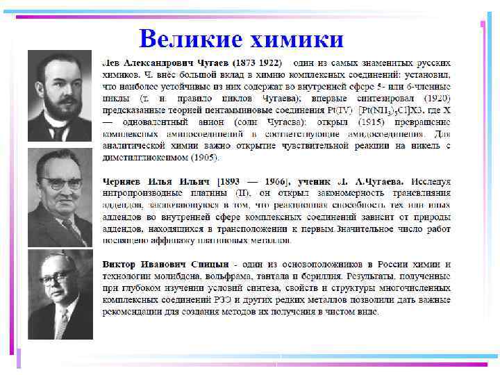 Координационная теория (1893 г. ) • Внутренняя и внешняя сфера комплексного соединения [MLx]Yz • Комплексообразователь M± • Лиганды L± • Координационное число КЧ • Дентатность лигандов • Многоядерные комплексы (мостиковые, смешанные, кластеры) Альфред Вернер (18661919), швейцарский химик