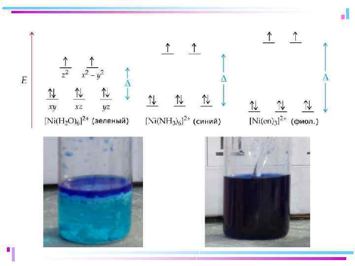 Цветность комплексов фиолет. [Ti(H 2 O)6]3+ бесцв. [Cd(H 2 O)6]2+ d d d + h Комплекс иодида титана(III) с карбамидом + h d • Комплексы Sc(III), Cu(I), Zn(II), Cd(II) и др. не поглощают энергии в видимой части спектра и поэтому бесцветны.