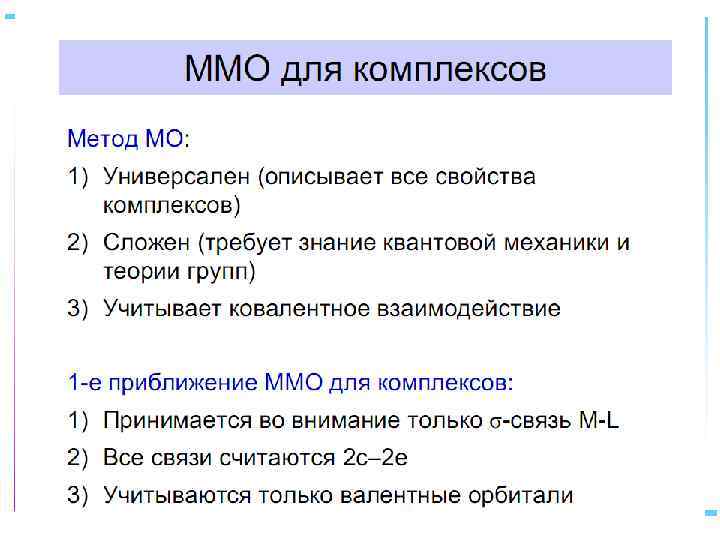 Квантовомеханические теории строения комплексных соединений • Для объяснения строения комплексных соединений наиболее широко применяются теория валентных связей (метод валентных связей) и теория кристаллического поля. • В рамках метода валентных связей считается, что между комплексообразователем и лигандами существует чисто ковалентная связь, которая реализуется по донорноакцепторному механизму.