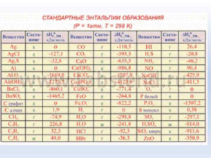 Стандартная теплота образования вещества - тепловой эффект реакции образования одного моль вещества из простых веществ в стандартных условиях (ΔН 0298) (Т = 298 К и Р = 1 атм)