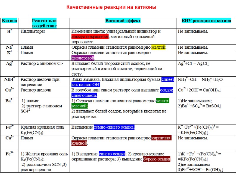 РЕАКЦИИ В РАСТВОРАХ ЭЛЕКТРОЛИТОВ 1. Реакции нейтрализации (образование воды) HCl(р-р) + KOH(р-р) KCl(р-р) + H2O(ж) Ионное уравнение: H + CI + K + OH K + CI + H2O Краткое ионное ур-е: Н + ОН Н2О 2. Реакции осаждения (образование нерастворимой соли) CaCl2(р-р) + Na2SO4(р-р) NaCl(р-р) + CaSO4 (т) Ионное уравнение: Са (р-р) + SO4 (р-р) CaSO4(тв) 3. Реакции образования газообразного вещества CaCO3(т) + 2HCI(р-р) СaCI2(р-р) + H2O(ж) + CO2(газ) Ионное уравнение: CaCO3 +2H (р-р) Ca (р-р) + Н2О(ж) +СО2(г) +2 -2 + +2 + _ + _ + _ + _