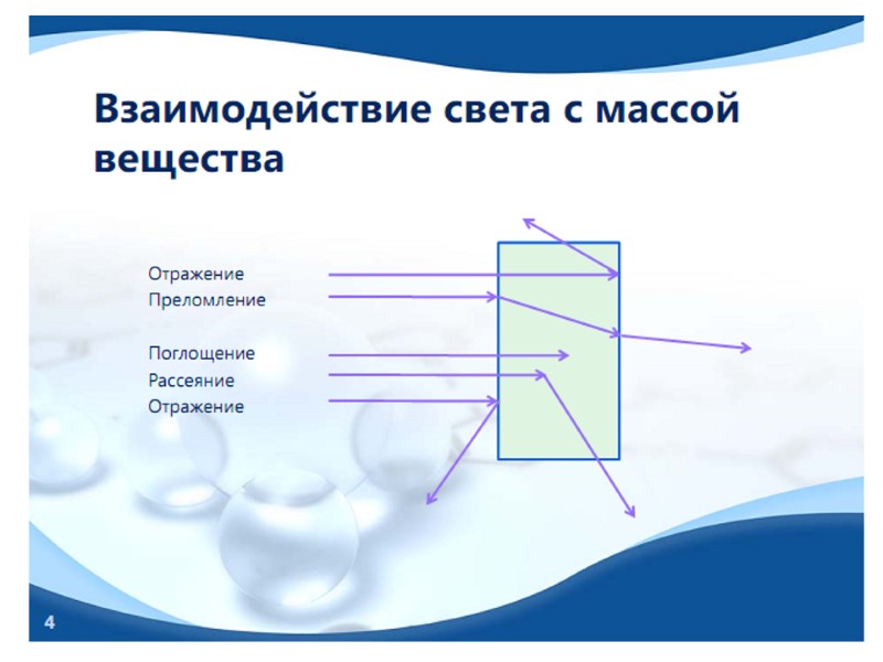 3) Частички жидкой или твердой фазы в газе Частички твердого тела в газе Капельки воды в газе т/г ж/г Г/Ж Газовые эмульсии, пены Газированная вода, мыльная пена. Ж/Ж Эмульсии, кремы Молоко, майонез, краски, лаки. Т/Ж Золи, суспензии, гели, пасты Краски, золи металлов. Г/Т Пористые тела, твердые пены Хлеб, сыр, пенопласты. Ж/Т Пористые тела Древесина Т/Т Сплавы, твердые золи Чугун, сталь, бетон, цемент Ж/Г Туман, капли Аэрозоли, моторн. топливо Т/Г Порошки, пыль, дым Аэрозоли, пыль в воздухе Дисперсная фаза (что) Дисперсионная среда (в чем) ПРИМЕРЫ 3.
