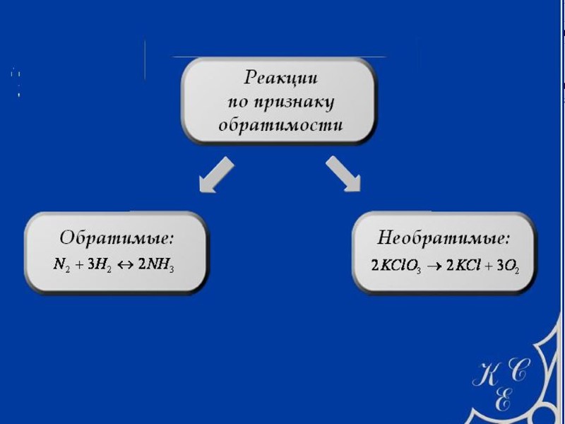 ОБРАТИМЫЕ И НЕОБРАТИМЫЕ ХИМИЧЕСКИЕ РЕАКЦИИ Реакции между соединениями происходят только потому, что исходные соединения находятся в неустойчивом состоянии и стремятся перейти в устойчивое состояние ПРИМЕРЫ 1. Обратимая химическая реакция Неустойчивое состояние: N2 , 3H2 Устойчивое состояние: N2 + 3H2 2NH3 2. Необратимая химическая реакция Неустойчивое состояние: 2Fe, 3O2 Устойчивое состояние: 2Fe2O3 (2Fe + 3O2 2Fe2O3) – химическая коррозия металла