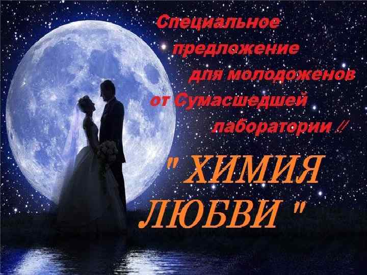 «Химия Любви» Данное шоу предназначено специально для молодых и гостей. В программу входит 8 -10 экспериментов. (Программу можно составить индивидуально, учитывая пожелания клиента) В процессе шоу молодые смогут измерить чувства друга при помощи наших опытов и экспериментов. Так же молодожены узнают, чувствуют ли гости торжества столь сильную любовь супругов. Проверим это с помощью нашего специального устройства!