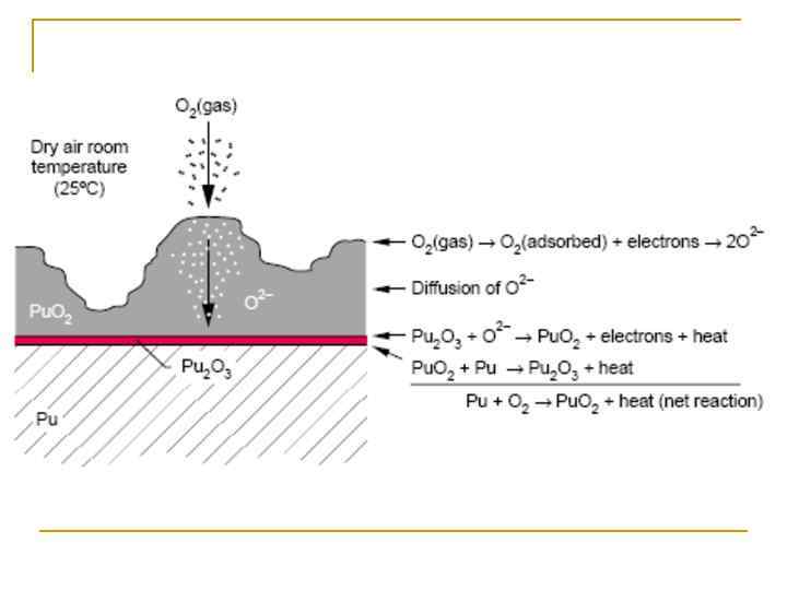 Металл n n n Металл пирофорен Образование оксидной пленки q Может включать различные оксиды q Медленное окисление в сухом воздухе n Скорость существенно возрастает в присутствии воды Pu 2 O 3 образуется в отсутствии или низкой концентрации O 2 Гидрид Pu (Pu. Hx, где 1. 9 < x < 3) увеличивает скорость окисления до 1013 Pu. O 2+x - в присутствии воды