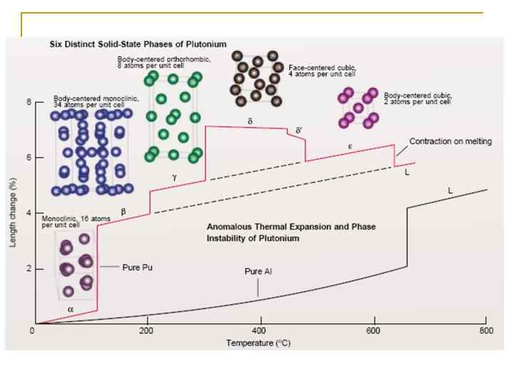 Металл n n n 6 аллотропных модификаций q 7 ая – при повышенном давлении Энергии аллотропных модификаций близки q Pu чувствителен к изменению температуры, давлению Плотности существенно отличаются q значительные изменения объемов при фазовых переходах ( -максимально плотная, Pu – 6 по плотности после Os, Ir, Pt, Re, Np) Pu расширятся при затвердевании из расплава Температура плавления – 640 C Жидкий Pu – очень большое поверхностное натяжение при высокой вязкости