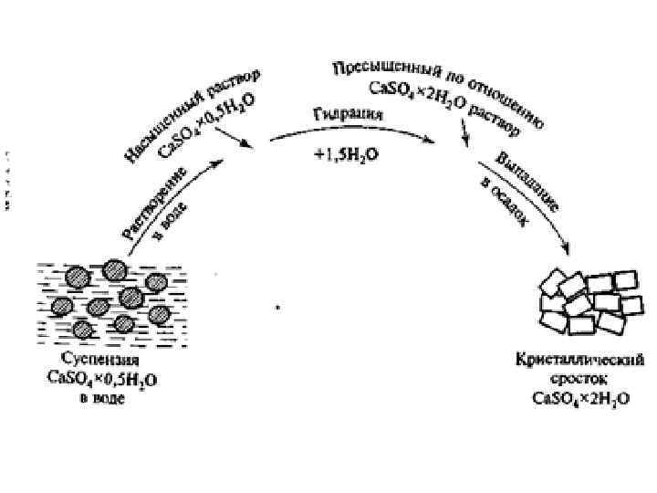 Дальнейшее выделение Ca. SO 4 · 2 Н 2 О ведет к росту кристаллов, утоньшению гидратных оболочек между и разрушению коллоидного состояния вещества. Возникает новая пространственная кристаллизационная структура, образуется искусственный камень, появляется механическая прочность.