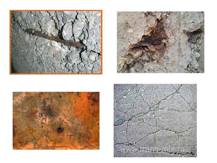 Электрохимическая Сквозь поры в цементном камне к арматуре проникает воздух и влага. Подвод их к поверхности металла осуществляется не равномерно из-за чего на разных участках поверхности наблюдаются разные потенциалы – протекает электрохимическая коррозия. Скорость протекания электрохимической коррозии арматуры зависит от влагопроницаемости, пористости бетонного камня и наличия в нем трещин. Биологическая Кроме вышеописанных коррозионных разрушений бетона при наличии микроорганизмов возможно протекание биокоррозии. Грибки, бактерии и некоторые водоросли могут проникать в поры бетонного камня и там развиваться. В порах откладываются продукты их метаболизма и постепенно разрушают структуру бетонного камня