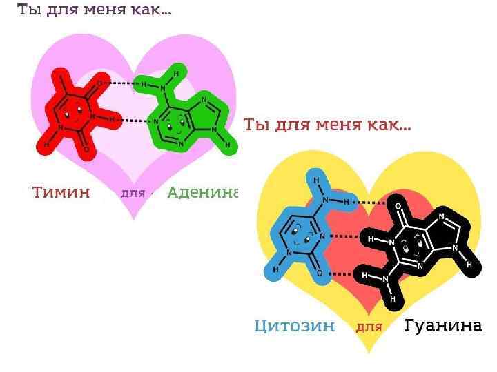 Строение ДНК • В ДНК две полинуклеотидные цепи • Цепи закручены в спирали по 10 пар оснований на виток • Цепи закручены вокруг друга, образуют двойную спираль • Цепи удерживаются водородными связями между азотистыми основаниями • Цепи комплементарны другу • В структуре ДНК заложена возможность воспроизводить себе подобных